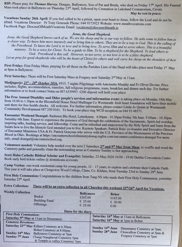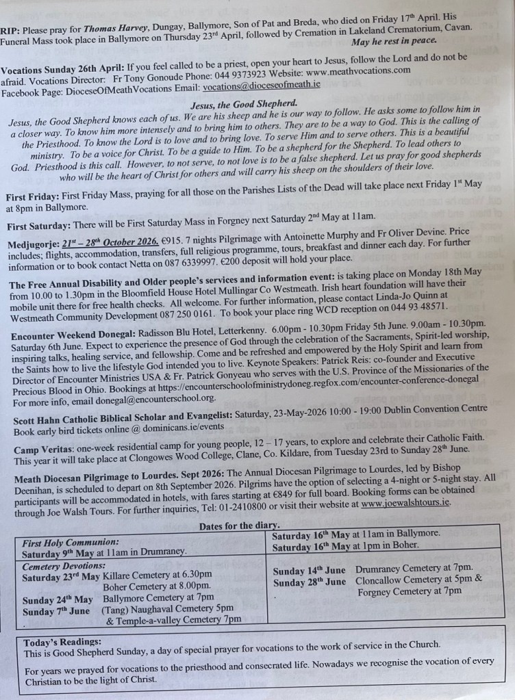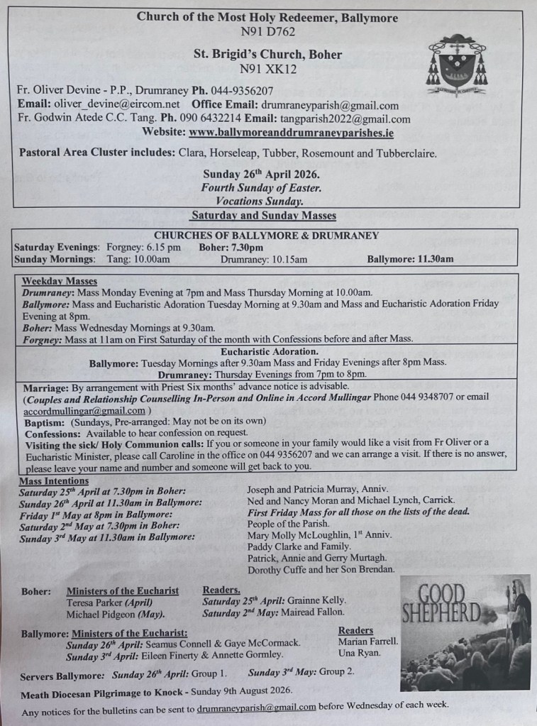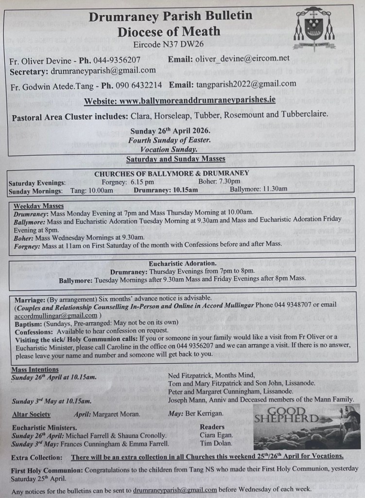 Weekly Parish Bulletins Sunday 26th April 2026. Share this: Share on X (Opens in new window) X Share on Facebook (Opens in new window) Facebook Like Loading...